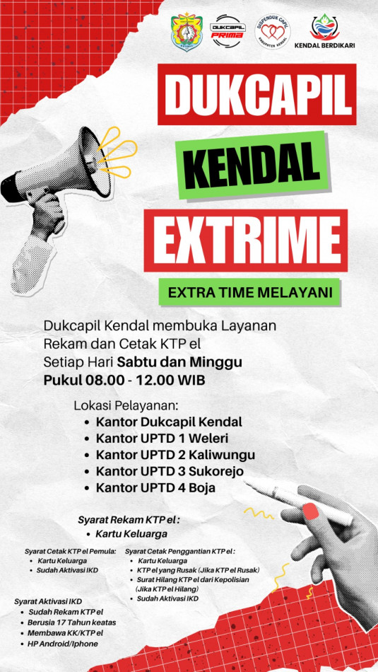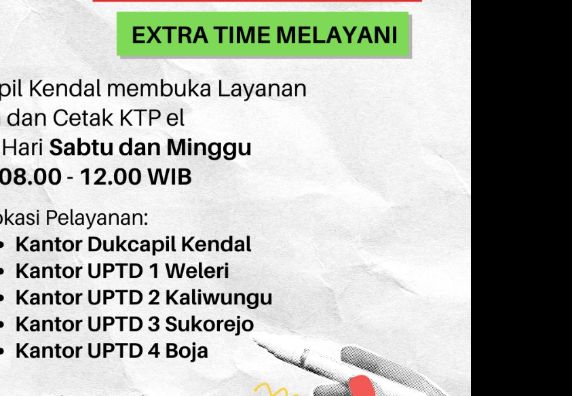Dukcapil Kendal membuka layanan rekam dan cetak E-KTP pada hari Sabtu-minggu pada pukul 08.00-12.00 di kantor UPTD Capil masing-masing.