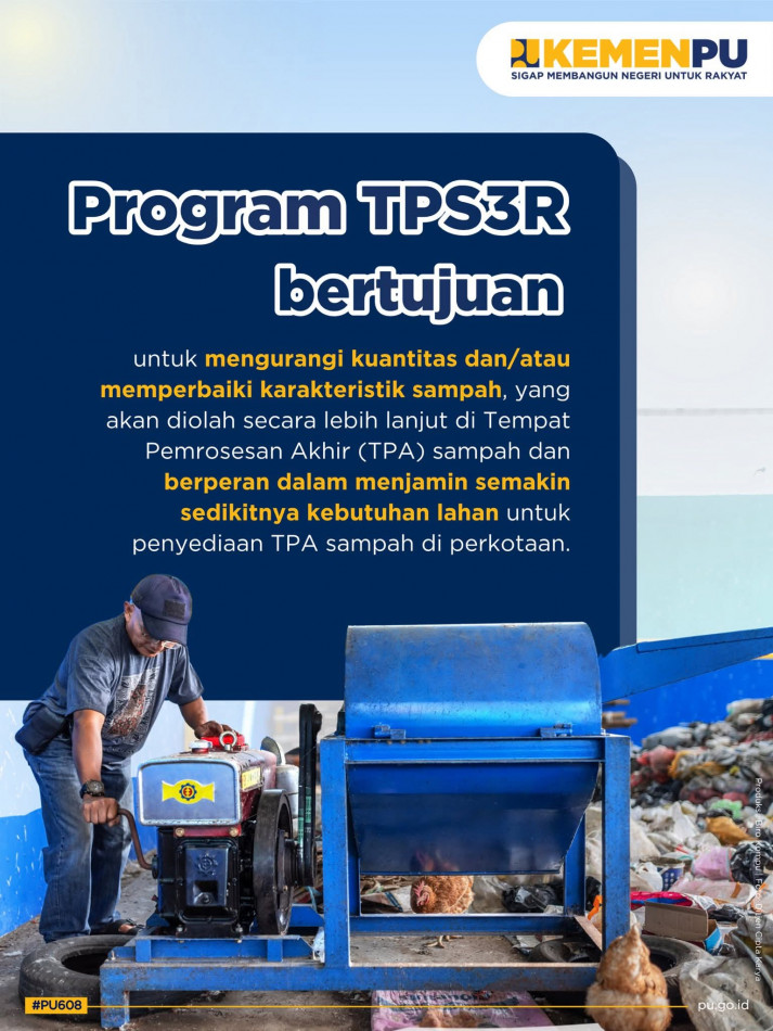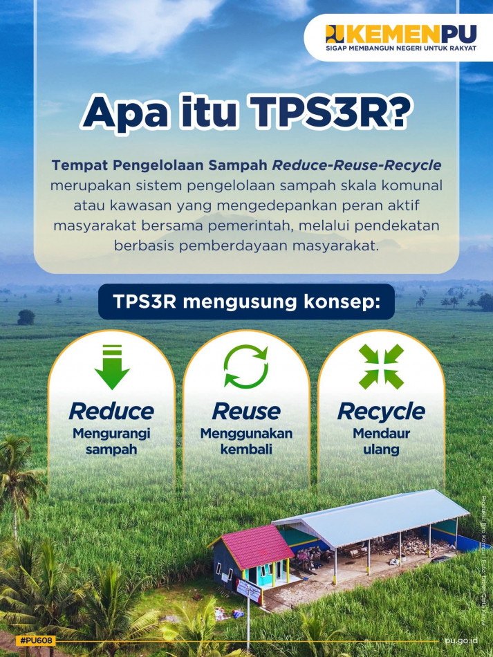 TPS3R adalah Tempat Pengelolaan Sampah Reduce-Reuse-Recycle merupakan sistem pengelolaan sampah skala komunal atau kawasan yang mengedepankan peran aktif masyarakat bersama pemerintah dengan melalui pendekatan berbasis pemberdayaan masyarakat.