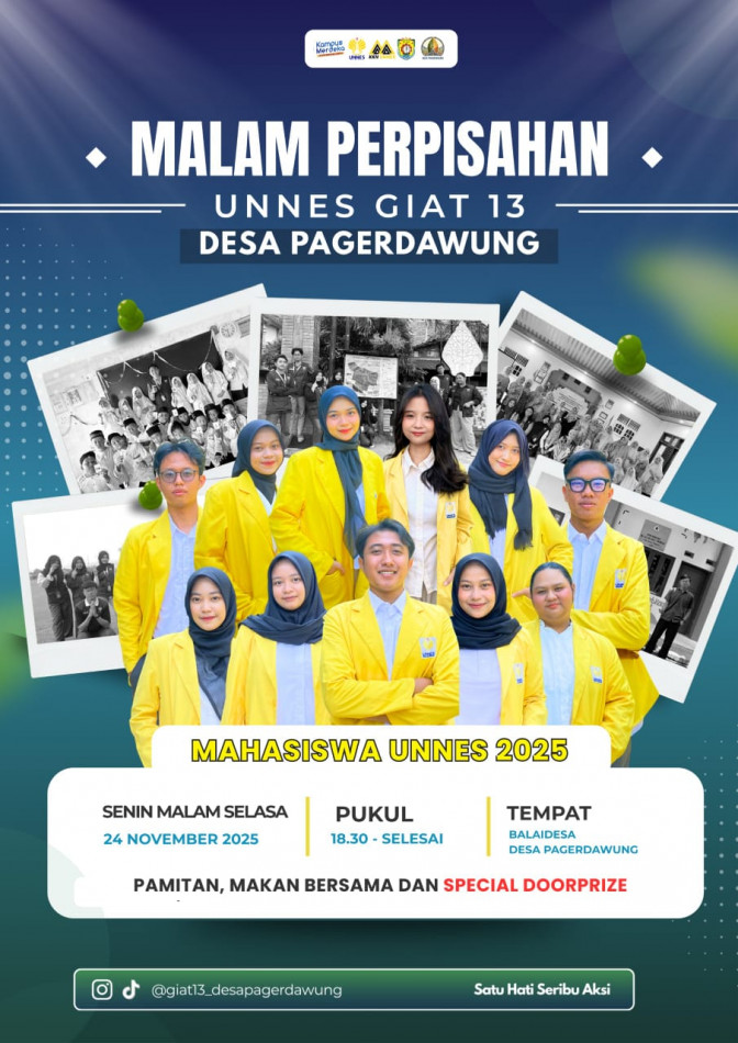 Senin, 24 November 2025 menjadi malam perpisahan yang penuh kehangatan KKN Giat 13 UNNES Desa Pagerdawung setelah melaksanakan KKN selama 2 bulan. Sukses selalu untuk Mahasiswa yang akan kembali ke kampung masing-masing. Terima kasih telah berbagi ilmu dan kenangan manis selama di Desa Pagerdawung.