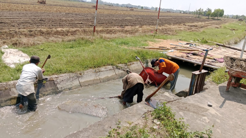 Sejumlah petani melaksanakan bersih-bersih saluran irigasi dari sedimen lumpur. Kegiatan ini bertujuan agar air dapat mengalir lancar samphinke persawahan blok Sejombor dalam rangka persiapan musim tanam padi.